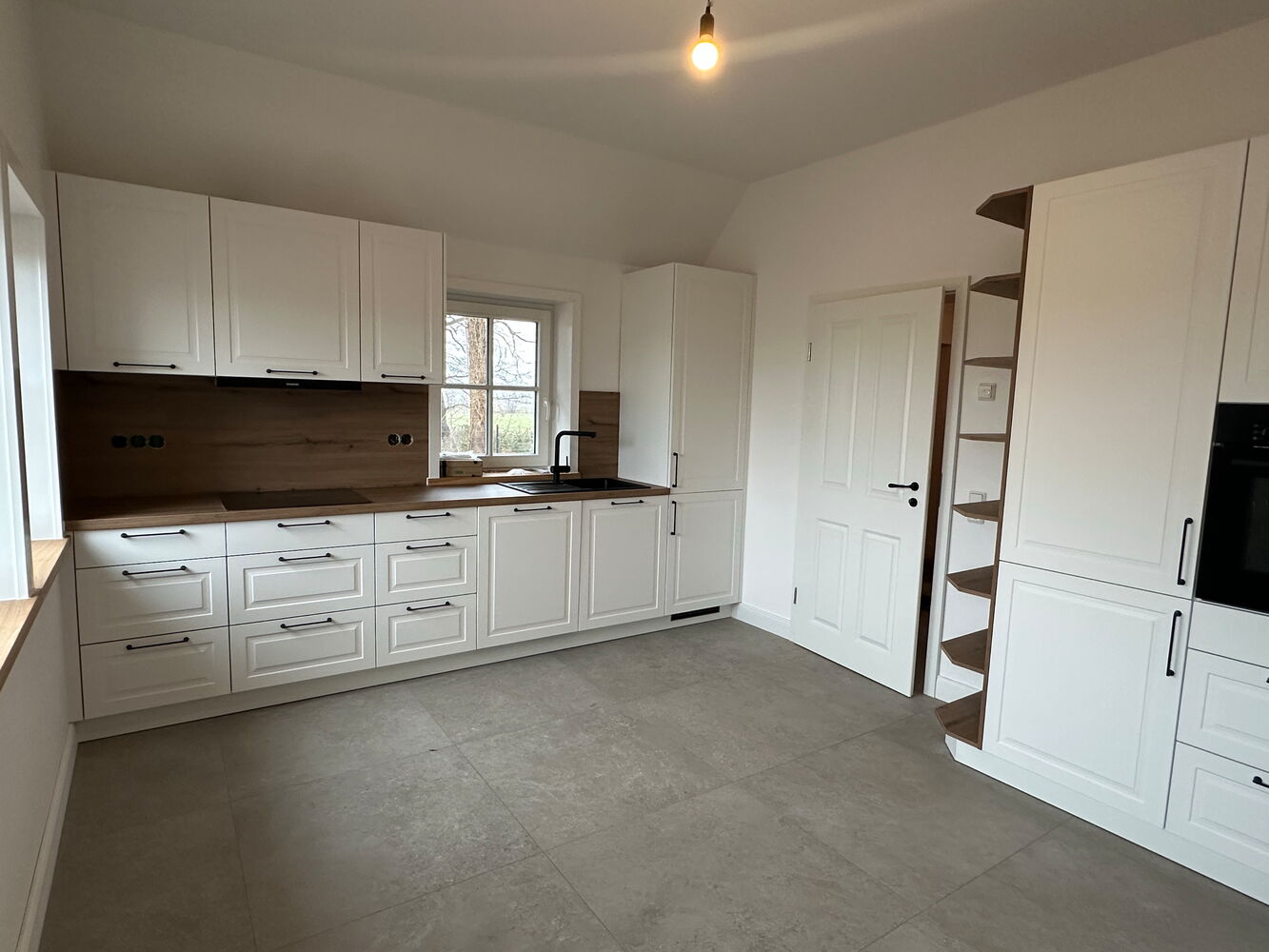 Die helle Einbauküche ist großzügig bemessen und bietet ausreichend Platz zum Kochen und für einen Essbereich.